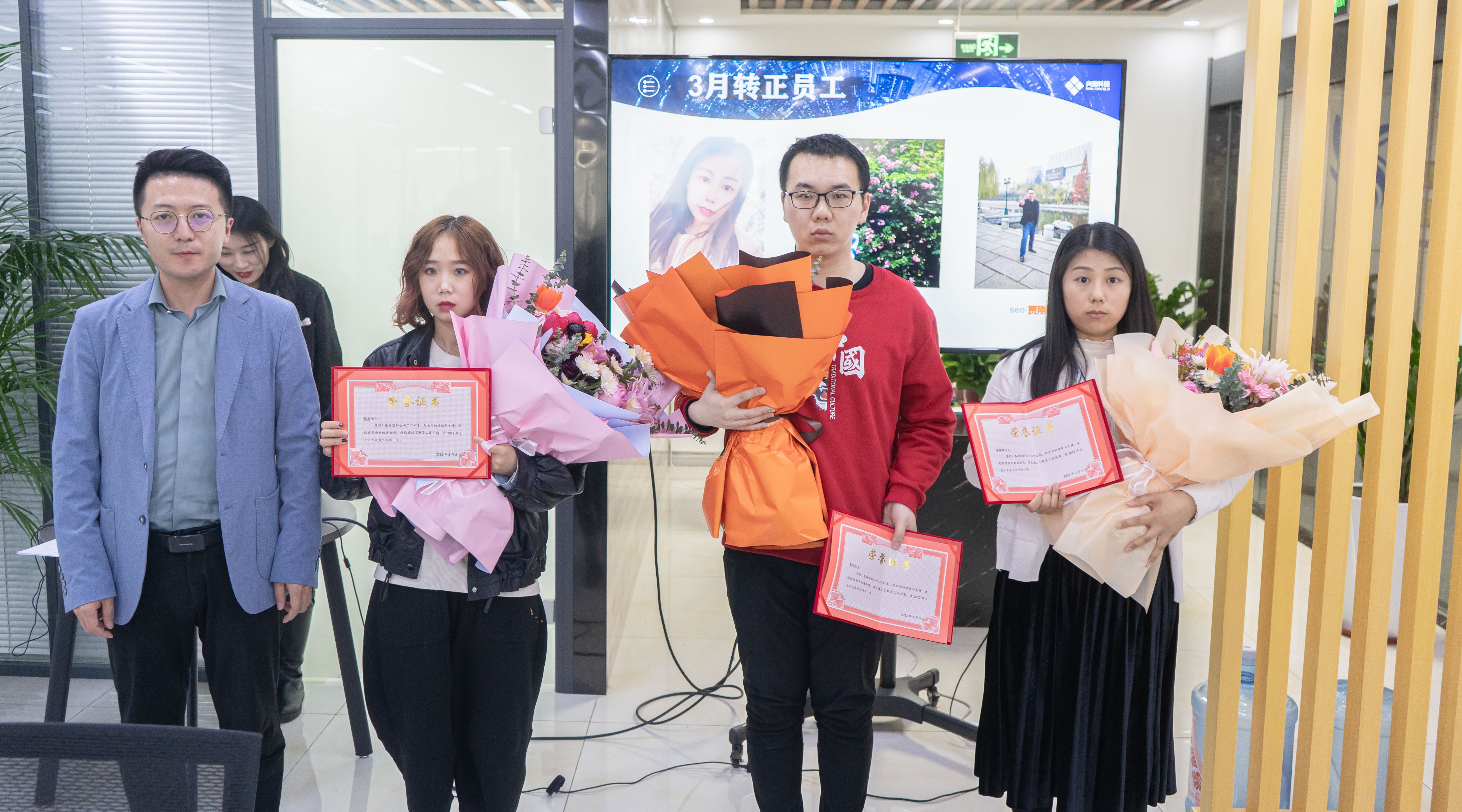 會(huì)議第三項(xiàng),員工轉(zhuǎn)正儀式,恭喜大家正式成為一名興田人,希望本次轉(zhuǎn)正的三位小伙伴可以與興田一起成長,為公司的發(fā)展增光添彩。